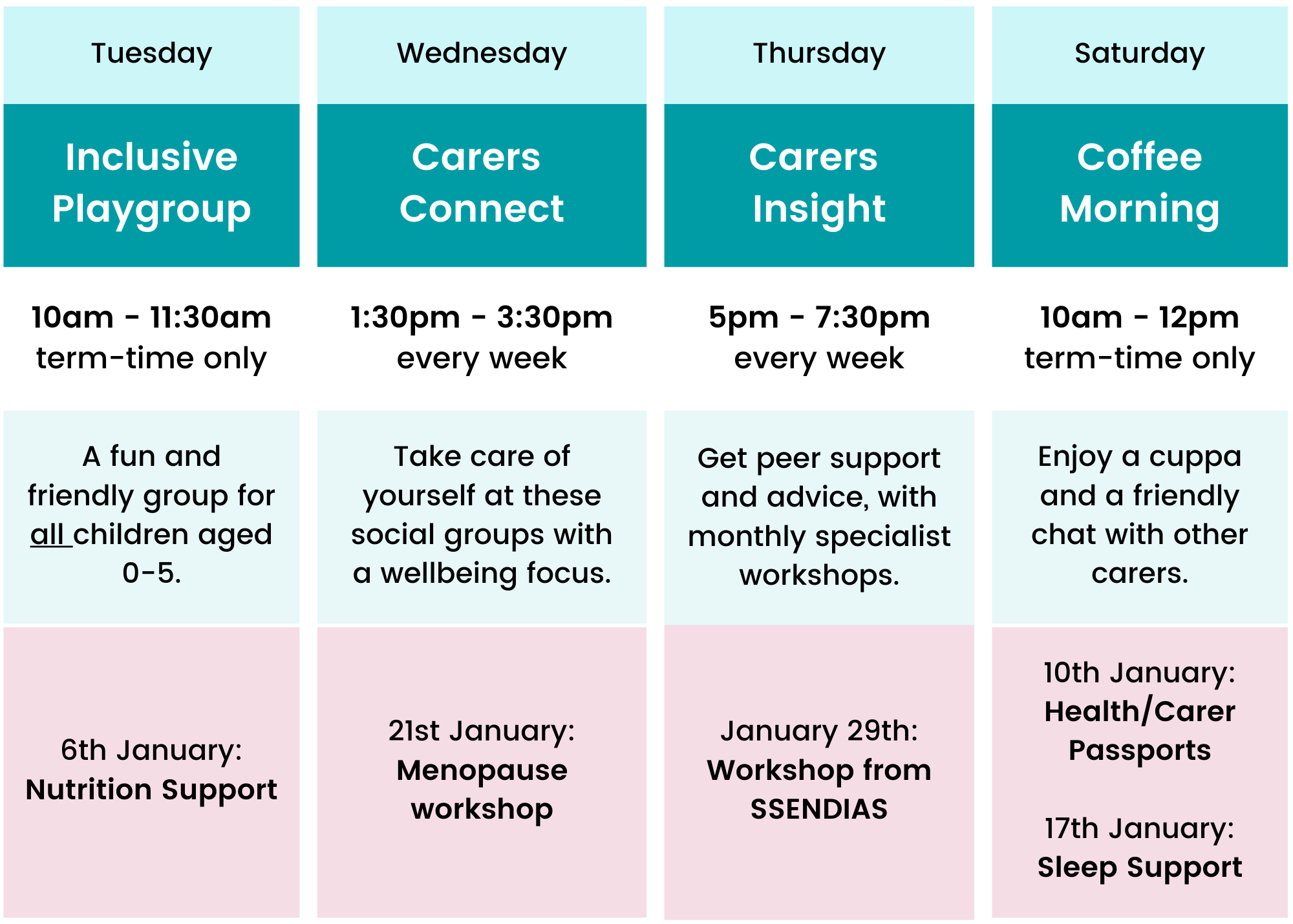 All family carers for a learning disabled and/or autistic person are welcome at our Caring for Carers groups (timetable below).